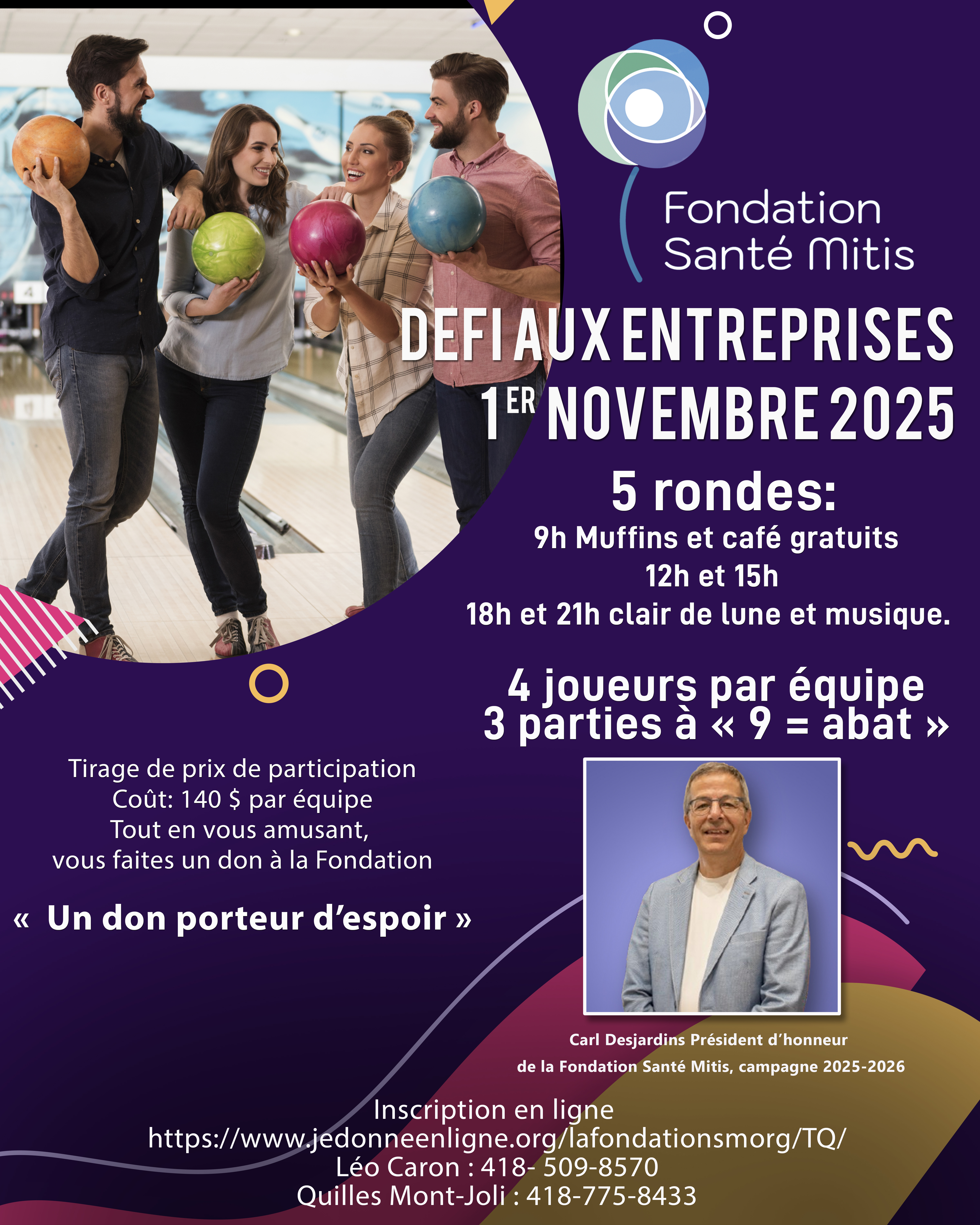 La Fondation Santé Mitis est heureuse de vous inviter à la 11e édition de son tournoi de quilles, qui se tiendra le samedi 1er novembre 2025. Nous encourageons les entreprises à profiter de cette occasion pour offrir à leurs employé(e)s une journée de divertissement et de camaraderie.